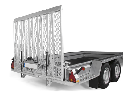 För entreprenörer och maskinuthyrare som fraktar små, tunga maskiner, t.ex. minigrävare och grävare. Utmärkt uppkörningsvinkel tack vare den långa rampen. Gångborden på sidorna gör det lätt att stiga in och ut ur lastade maskiner. Integrerade stödben förenklar lastning. Vagnen på bilden kan vara extrautrustad.