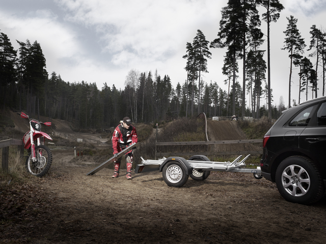 Med denna trailer är det enkelt och bekvämt att transportera alla sorters motorcyklar och mopeder. Vagnarna har hög säkerhet med smart fastsurrning. Låg uppkörningsvinkel, utmärkta köregenskaper och flyttbar uppkörningsramp. Vagnen på bilden kan vara extrautrustad.