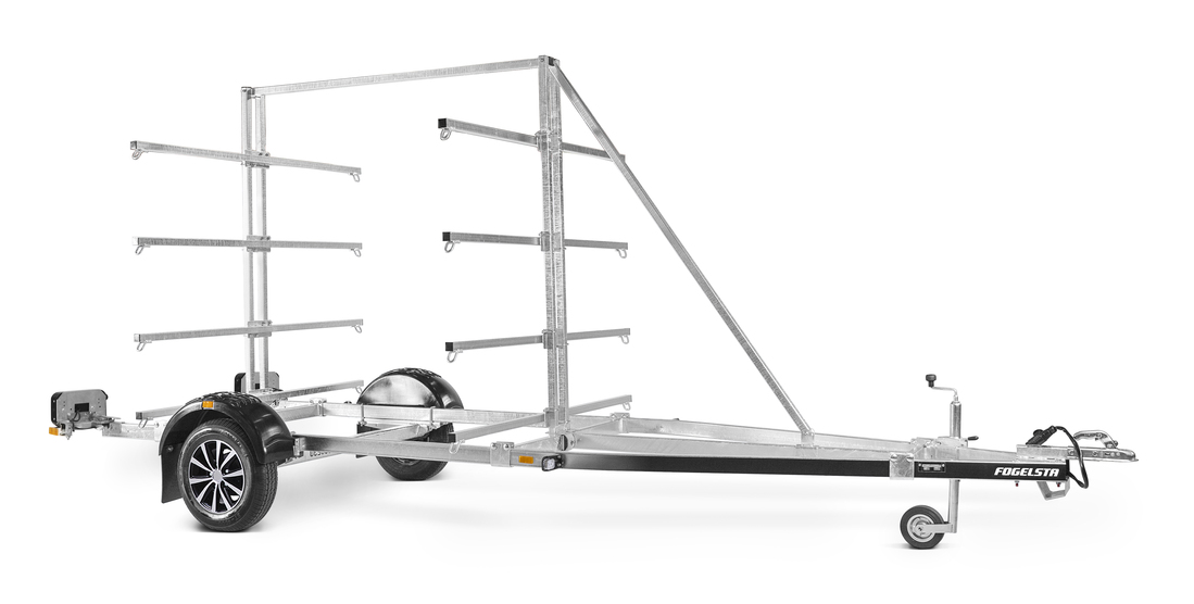 Med våra kanottrailers har du möjlighet att transportera upp till 16 kajaker eller 8 kanoter. Ställningen går lätt att justera efter kanoternas storlek. När kanotstället är monterat har trailern en totalhöjd på cirka 240 cm. V-drag och justerbar hjulaxel hjälper till att göra ekipaget stabilare och säkrare. Själva stativet har följande mått, höjd 200 cm, längd 199 cm, bredd 191 cm, lastlängd 344 cm och lastbredd per sida 85 cm. Båttrailern på bilden kan vara extrautrustad.