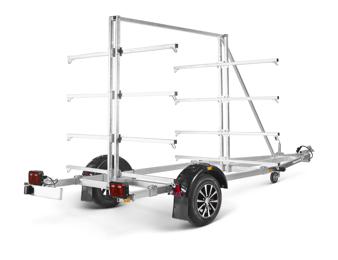 Med våra kanottrailers har du möjlighet att transportera upp till 16 kajaker eller 8 kanoter. Ställningen går lätt att justera efter kanoternas storlek. När kanotstället är monterat har trailern en totalhöjd på cirka 240 cm. V-drag och justerbar hjulaxel hjälper till att göra ekipaget stabilare och säkrare. Själva stativet har följande mått, höjd 200 cm, längd 199 cm, bredd 191 cm, lastlängd 344 cm och lastbredd per sida 85 cm. Båttrailern på bilden kan vara extrautrustad.